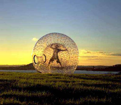 Zorbing was invented in the early 1990s by a pair of New Zealander friends who wanted to walk on water. After several different prototypes, they came up with the zorb, an inflatable ball made of clear plastic with a space inside that a person is strapped into. As the ball moves along over surfaces, the person rolls along inside it. In essence, it is a transparent hamster ball for humans … and it is supposed to be a ton of fun.